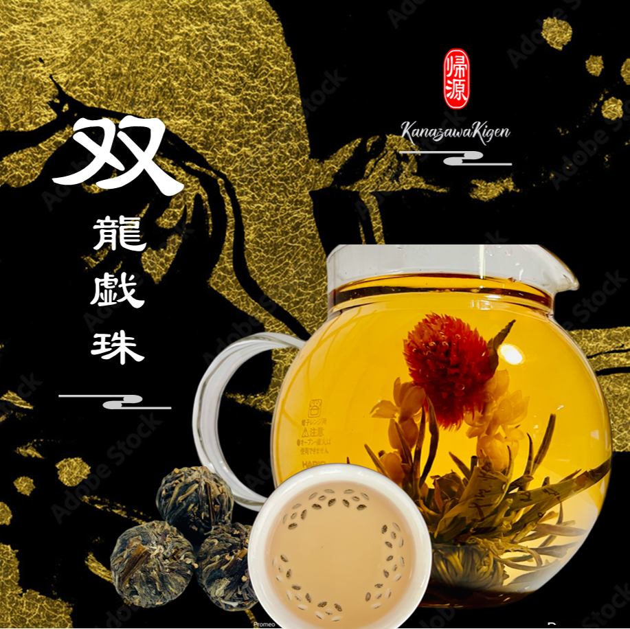 ジャスミン茶をベースに、珠に見立てた真っ赤な千日紅がジャスミンのアーチの先に堂々と花開きます。